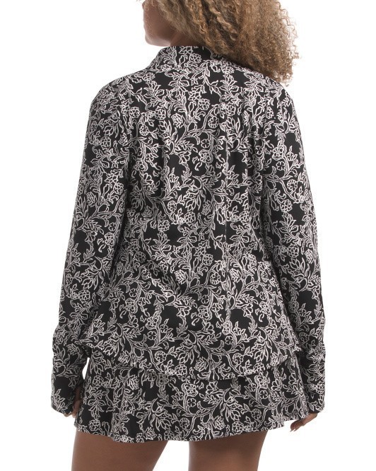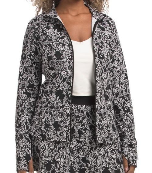 This jacket zips up the front and has 2 front zip pockets. The stretchy knit fabric is a Polyester & Spandex blend and has UPF 50 Sun Protection.